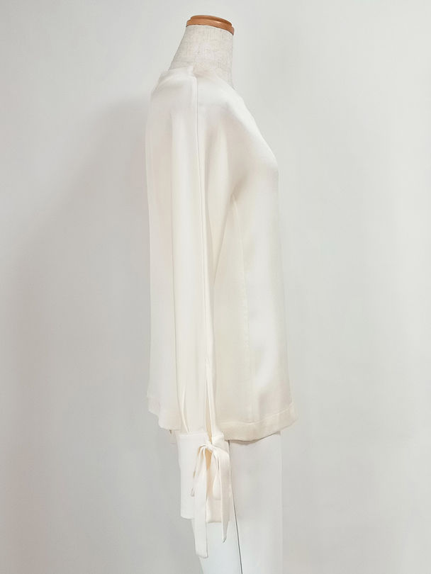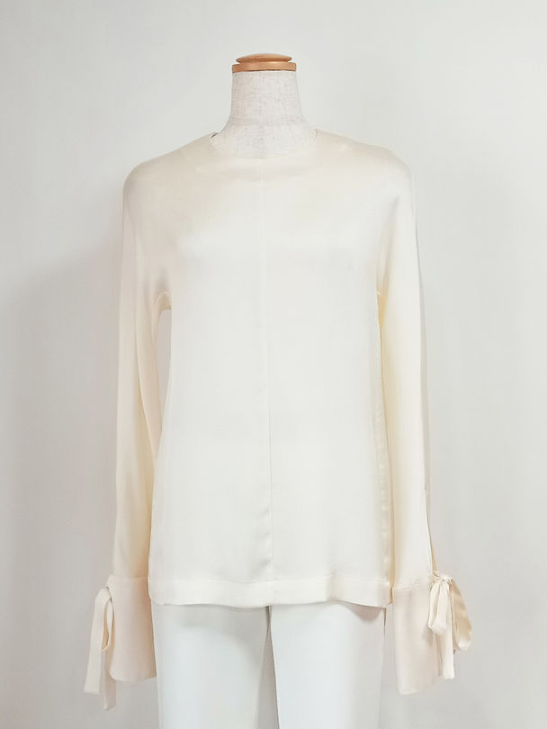 リボン付カフス・クルーネック・サテンブラウス
