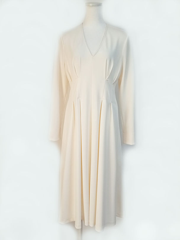 Vネック、ウェストピンタク入りミモレ丈ワンピース